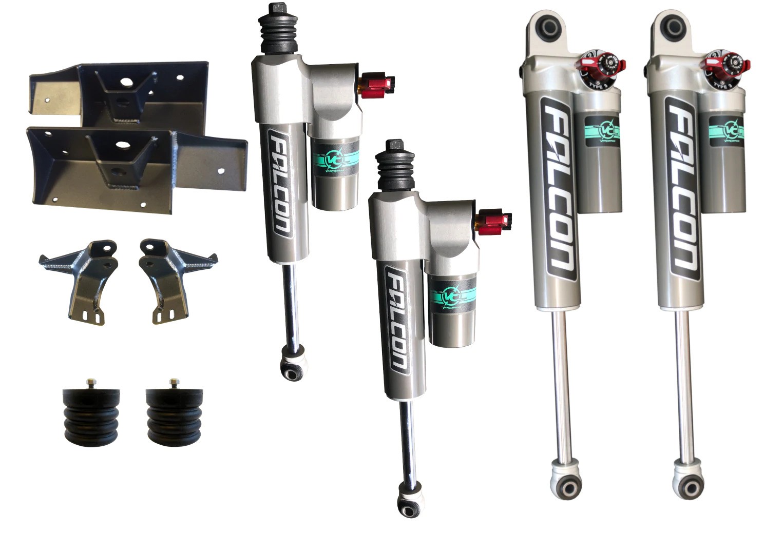 - Front Falcon 2.315″ piggy back reservoir 3.3 Fast Adjust Shocks